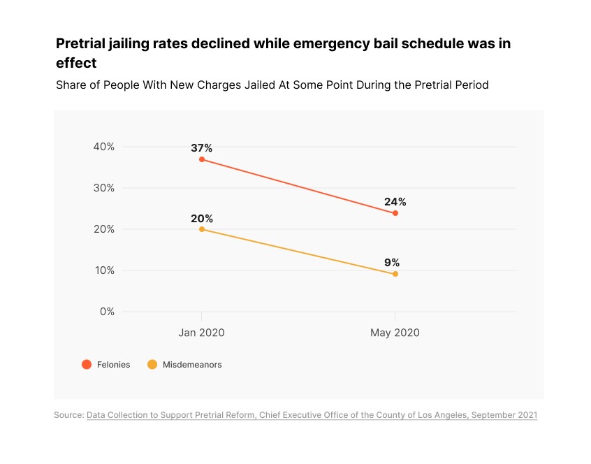 - In January 2020, before the emergency bail schedule took effect, 37% of people charged with felonies were jailed before trial. That rate had decreased to 24% by May 2020. The detention rate increased through the summer and fall but, at year end, it remained slightly lower than pre-pandemic levels. The trend was similar for people charged with misdemeanors, with the detention rate declining from 20% in January 2020 to 9% in May 2020 and finishing the year below pre-pandemic levels.