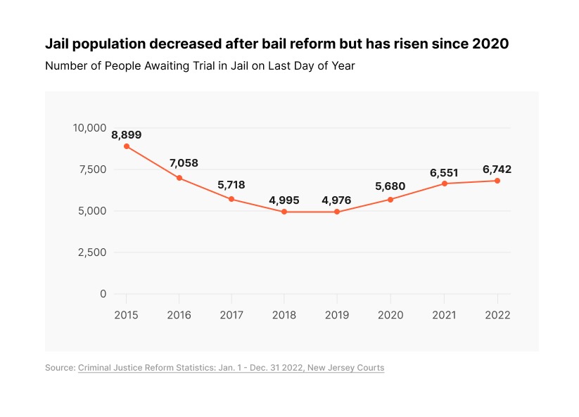 - The number of people jailed before trial decreased from roughly 7,300 on January 1, 2020 to 5,000 in May 2020, a decline of more than 30%. The population rose to more than 6,000 by the end of 2020 and fluctuated between roughly 5,600 and 6,600 for the final 18 months of the emergency bail schedule period. Since the emergency bail schedule period ended, the pretrial jail population has grown, nearing pre-pandemic levels.
