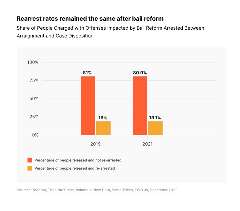 - The share of people rearrested while awaiting trial for a bail reform-eligible offense was roughly the same in 2019 (before the reforms took effect) and 2021 (the year after the reforms took effect).